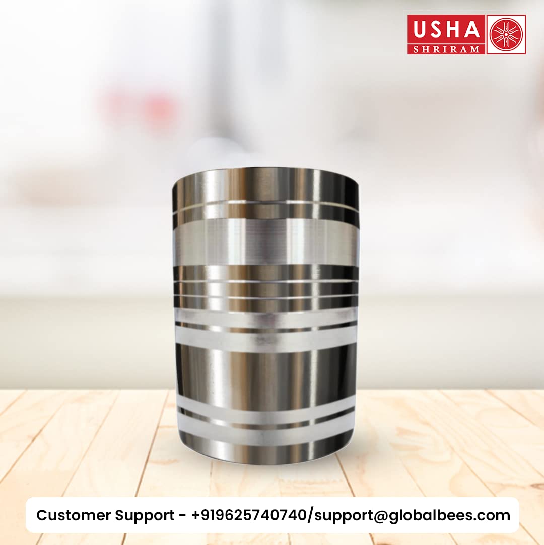 Usha Shriram brings you a range of high-quality stainless steel kadhai, patila, glass and thali sets for your kitchen. This stainless-steel glass is made of premium quality steel, ensuring safe drinking for you and your family. Its shiny finish gives an elegant touch, an essential element for Indian dinnerware and can be used for hotels and restaurants. Available in a set of 6, these utensils are highly durable, easy to clean and stackable, making it the perfect dining experience for your family. These types of glasses are often insulated, with a vacuum layer between the inner and outer layers of stainless steel, to keep the contents hot or cold. Stainless steel glasses are a popular choice for outdoor activities and travel, as they are durable, lightweight, and easy to clean. They are also resistant to odors and tastes, so they do not retain the flavors of the liquids they contain. Some stainless steel glasses come with a silicone or plastic rim or handle to make them more comfortable to hold. They can be used for a variety of liquids, including water, coffee, tea, and other beverages.Detailed Specifications: