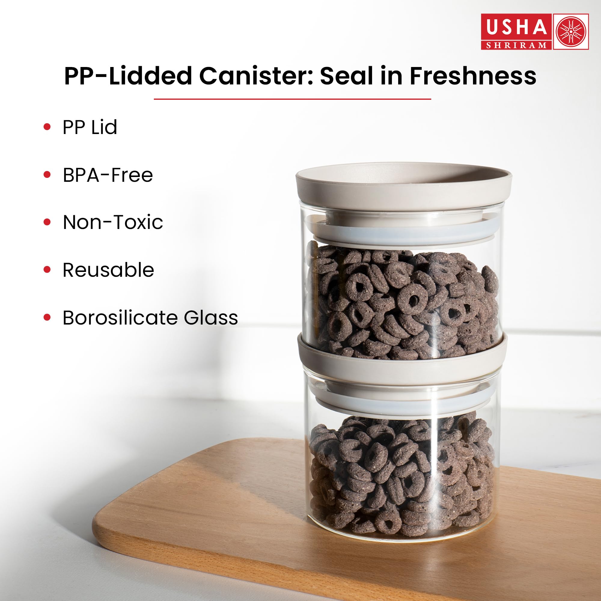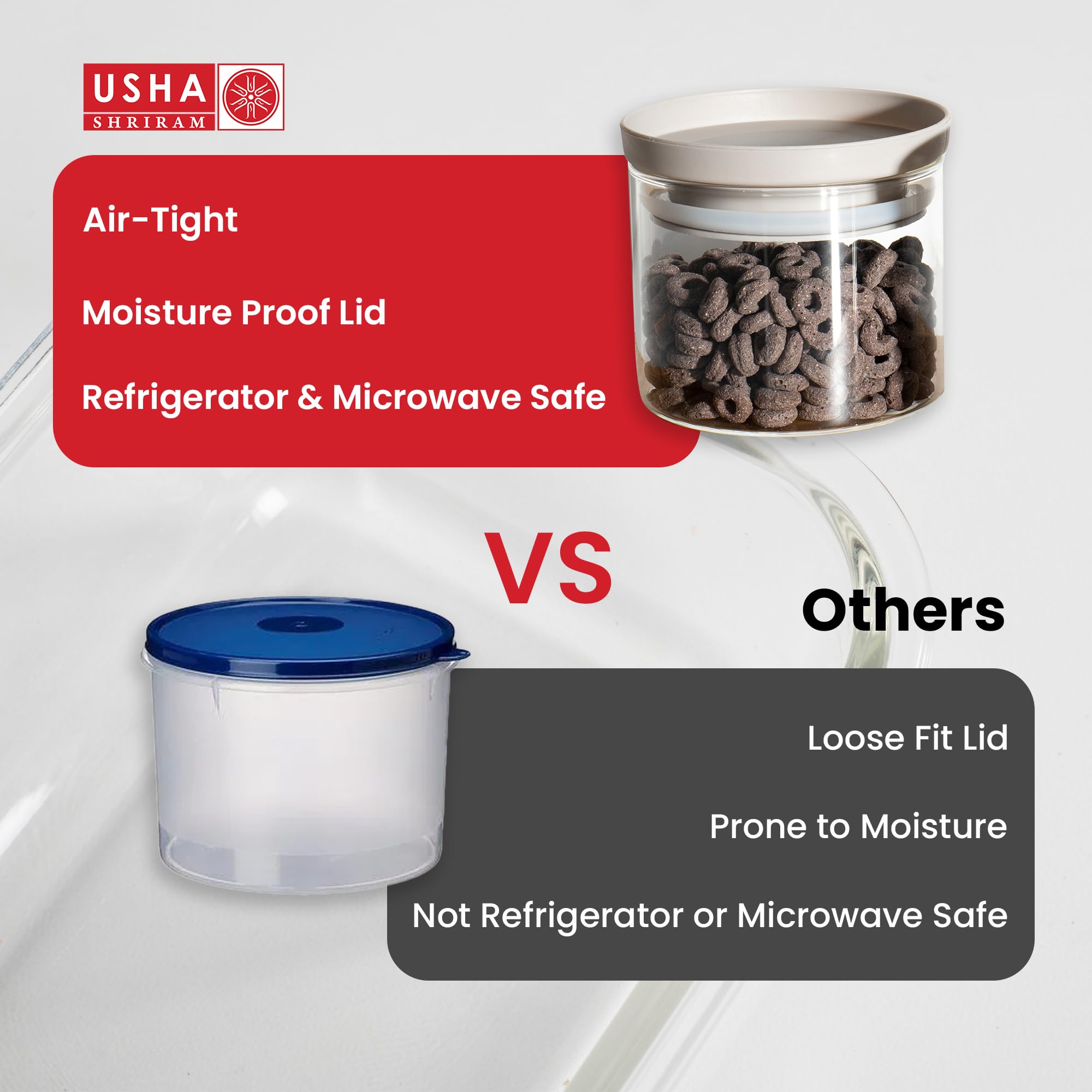 Introducing USHA SHRIRAM's Food Storage Canister, the perfect solution for organizing and preserving your kitchen essentials. With its glass sealed storage jar, you can easily see the contents and ensure their freshness. The canister is designed for convenient storage and can be stacked, maximizing your pantry or cabinet space. Featuring a negative pressure sealed design, it effectively preserves the flavour and freshness of your stored food items. Made from high-quality borosilicate glass and equipped with a food-grade silicone ring, this canister guarantees safety and durability. It is versatile and suitable for storing a wide range of dry food items, spices, and more. The premium materials used, including high borosilicate glass and PP, ensure longevity and a reliable storage option. Cleaning is a breeze, and the secure PP lid provides a tight seal to keep your food fresh and protected. Upgrade your kitchen organization with our Food Storage Canister and enjoy the benefits of a well-organized and preserved pantry.Detailed Specifications: