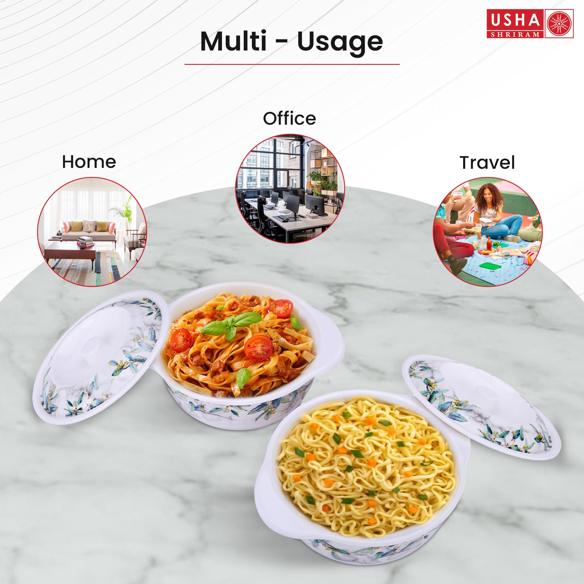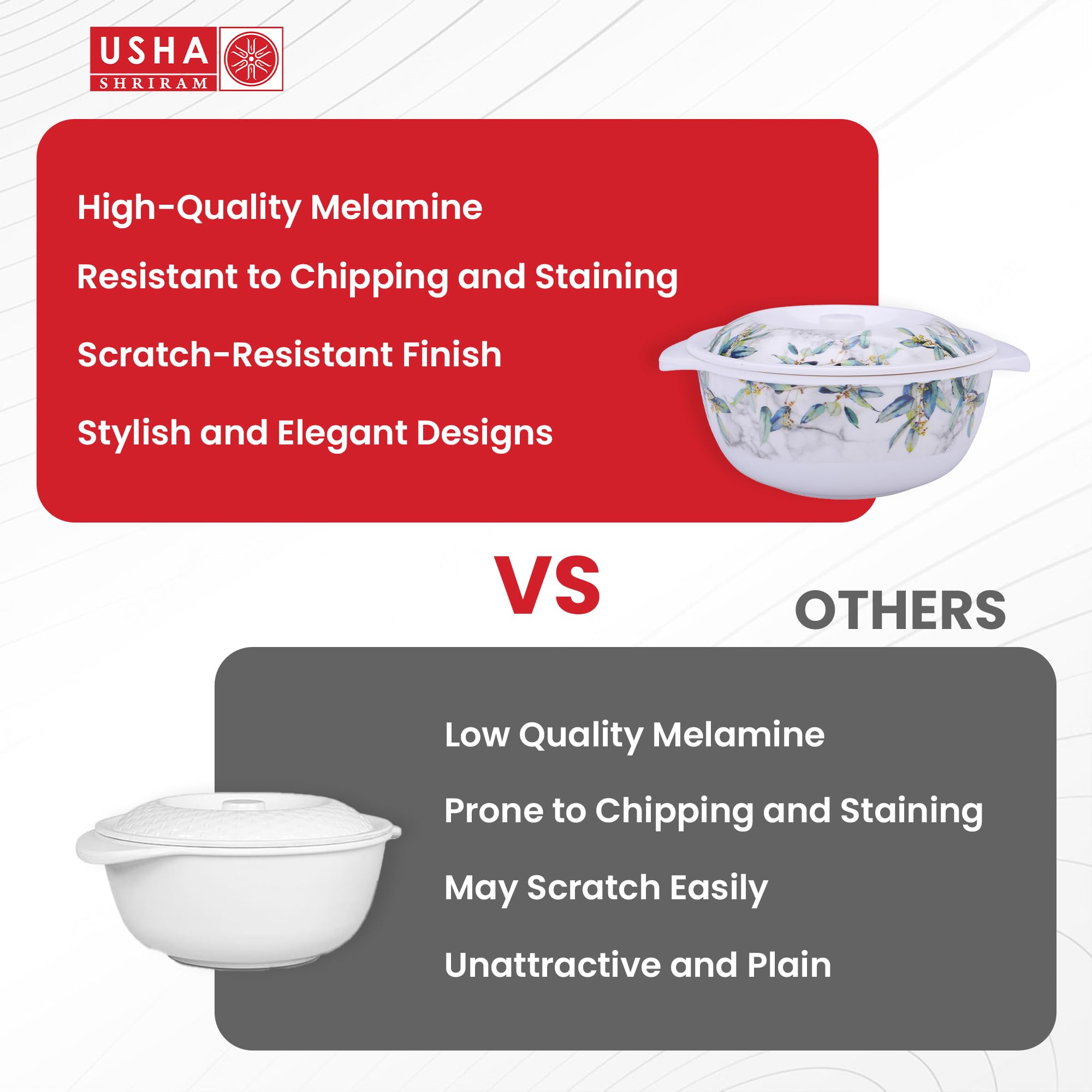 Introducing Usha Shriram's brand new line of melamine dinner sets, perfect for all your dining needs! Made from high-quality melamine resin, our dinnerware sets are lightweight, durable, and virtually unbreakable. Our dinner sets are available in a variety of colors and designs to suit every style and occasion. Whether you're looking for a classic white set for everyday use, or a bold and colorful set for outdoor entertaining, we have something for everyone. Each set includes plates, bowls, and cups, and some even come with matching utensils. The smooth, glossy finish of our melamine dinnerware gives it the appearance of real ceramic or porcelain, while the material itself is shatterproof and resistant to scratches and chips. Our melamine dinner sets are easy to clean and maintain, and are dishwasher safe for hassle-free cleaning. Plus, they are ideal for use both indoors and outdoors, making them perfect for picnics, barbecues, and camping trips. Please note that our melamine dinnerware is not microwave safe, and should not be used in the oven. Upgrade your dining experience with our stylish and practical melamine dinner sets today!Detailed Specifications: